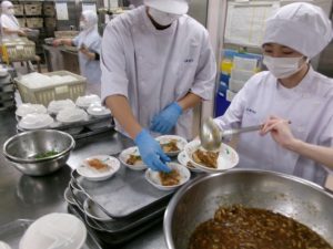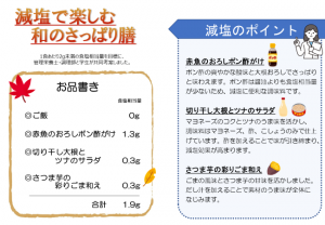 今回の「減塩で味わう和のさっぱり膳」は、赤魚、切干大根、さつま芋など、身近な食材を組合せて、減塩でもおいしく工夫された特別感のある内容でした。当日は、学生が料理の盛付けや病棟訪問を体験し、患者さんの感想を直接伺うことができ印象深かったようです。「減塩と感じない」「赤魚のポン酢がけが美味しかった」「彩りもよい」など、うれしい声をたくさんいただきました。