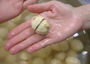 ポテトサラダ茶巾は、調理師が一つひとつ手で丸めて、丁寧に仕上げました。